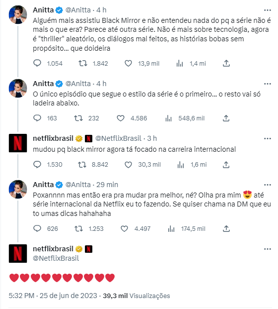 Anitta postou no Twitter sua opinião sobre a nova temporada de “Black Mirror”, da Netflix. Segundo a artista, a sexta temporada, que foi lançada neste mês na plataforma de streaming, trouxe roteiros com “diálogos mal feitos” e “histórias bobas e sem propósito”.