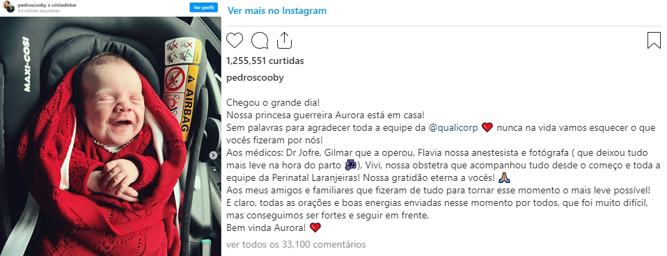 “Chegou o grande dia! Nossa princesa guerreira Aurora está em casa”, escreveu o casal nas redes sociais, agradecendo ainda aos médicos e amigos. “E claro, todas as orações e boas energias enviadas nesse momento por todos, que foi muito difícil, mas conseguimos ser fortes e seguir em frente.”