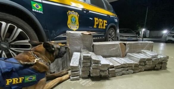 Policiais rodoviários federais, com auxílio de cães farejadores, apreenderam 56,35 Kg de maconha encontrados em um ônibus de viagem. O flagrante aconteceu na noite desta terça-feira (18), no Km 830 da BR 116, em Vitória...