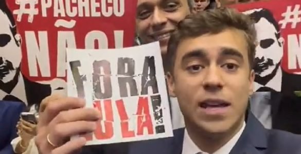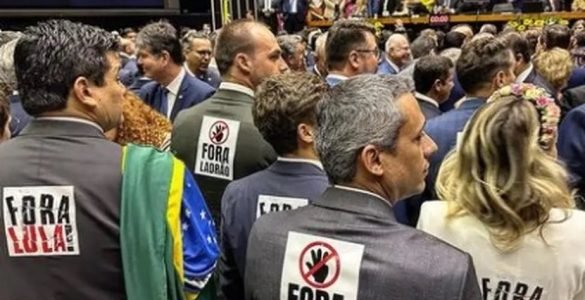 Parlamentares bolsonaristas levantaram cartazes com as frases ‘Fora Lula’, ‘Fora ladrão’ e ‘Pacheco não’ durante a cerimônia de posse de parlamentares na Câmara, nesta quarta-feira (1º). Os opositores do presidente Lula...