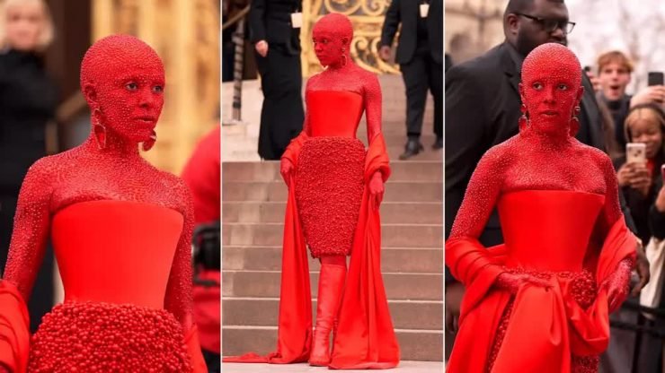 Doja Cat marcou presença na Semana de Moda de Paris com uma produção vermelha com 30 mil cristais colados no corpo.