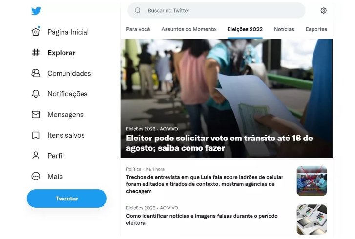 A partir desta quarta-feira (20), o Twitter disponibiliza uma espaço na rede social com informações sobre as eleições do Brasil, marcadas para outubro – 1º turno no dia 2 e, caso necessário, o 2º turno ocorre no dia 30.