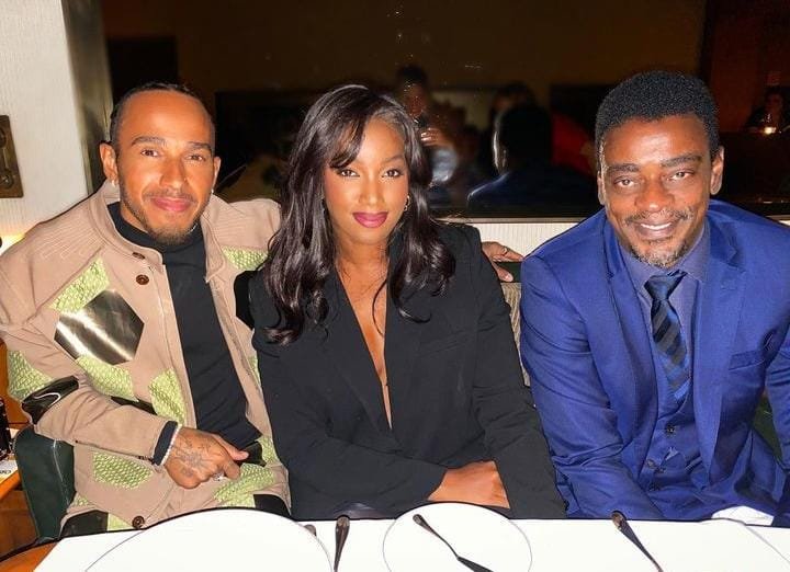 A cantora Iza publicou uma foto em que aparece ao lado do piloto inglês de Fórmula 1 Lewis Hamilton e do cantor Seu Jorge, na noite desta terça-feira, 8.