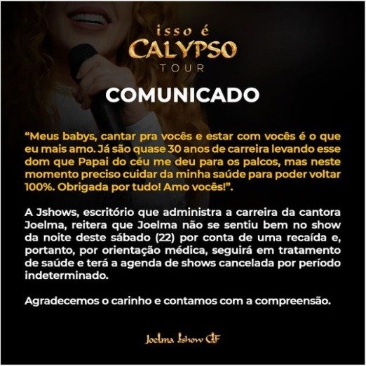 O comunicado reitera que a interrupção da agenda da artista é por orientação médica. “[Ela] seguirá em tratamento de saúde e terá a agenda de shows cancelada por período indeterminado. Agradecemos o carinho e contamos com a compreensão”, diz o informe.