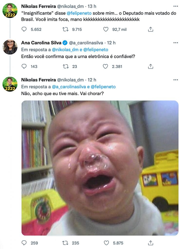 “Não, acho que eu tive mais. Vai chorar?”, publicou. O vereador adicionou uma imagem de um bebê chorando na publicação, em tom de deboche.
