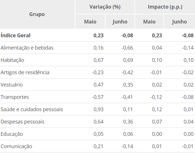 O Índice Nacional de Preços ao Consumidor Amplo (IPCA) foi de -0,08% em junho, 0,31 ponto percentual abaixo da taxa de maio (0,23%). É o que mostram os dados do Instituto Brasileiro de Geografia e Estatística (IBGE) nesta terça-feira, 11. Desta forma, o país registra uma deflação após 10 meses seguidos.