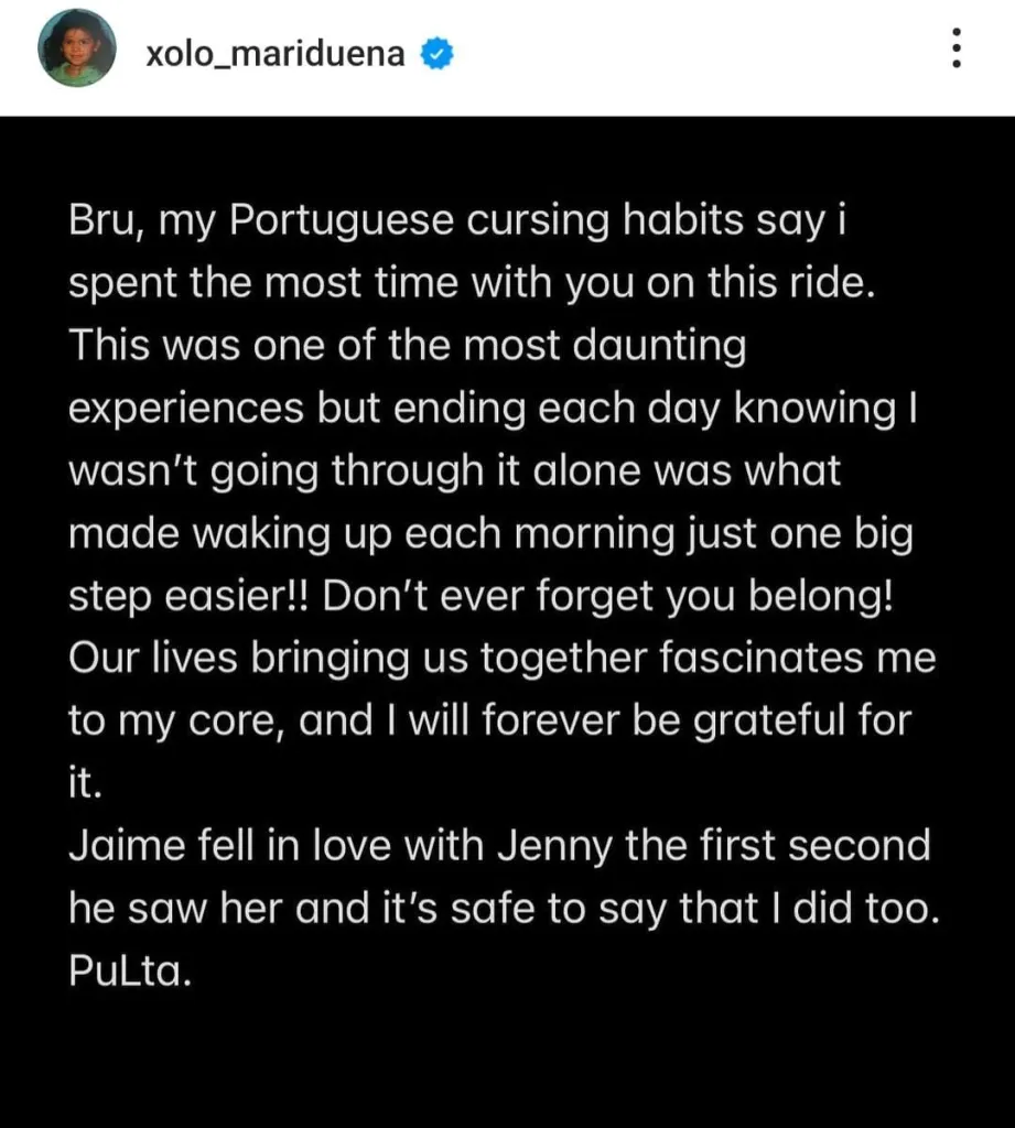 Bruna Marquezine agradeceu ao ator pelas palavras: “Agora não estou mais com vontade de postar o que escrevi, ‘senhor bom com palavras’. Nós te amamos, Xolito. Por favor, nunca mude”, escreveu.