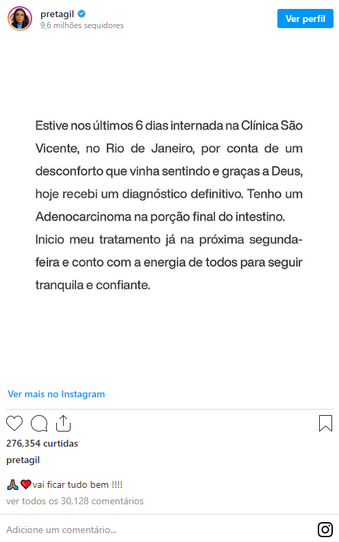 “Estive nos últimos 6 dias internada na Clínica São Vicente, no Rio de Janeiro, por conta de um desconforto que vinha sentindo e graças a Deus, hoje recebi um diagnóstico definitivo. Tenho um Adenocarcinoma na porção final do intestino”, contou.
