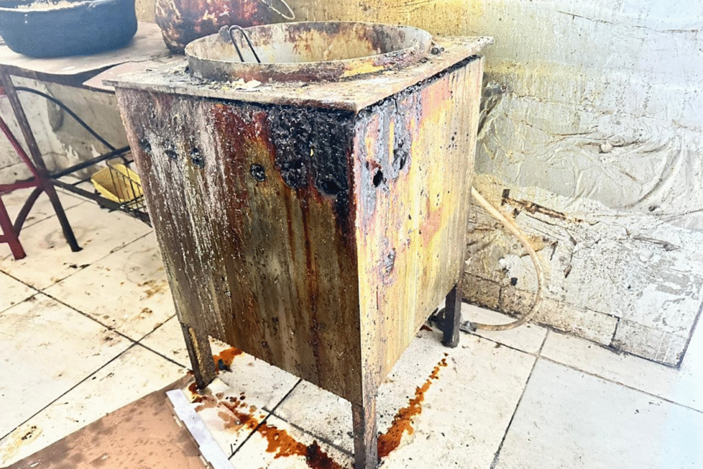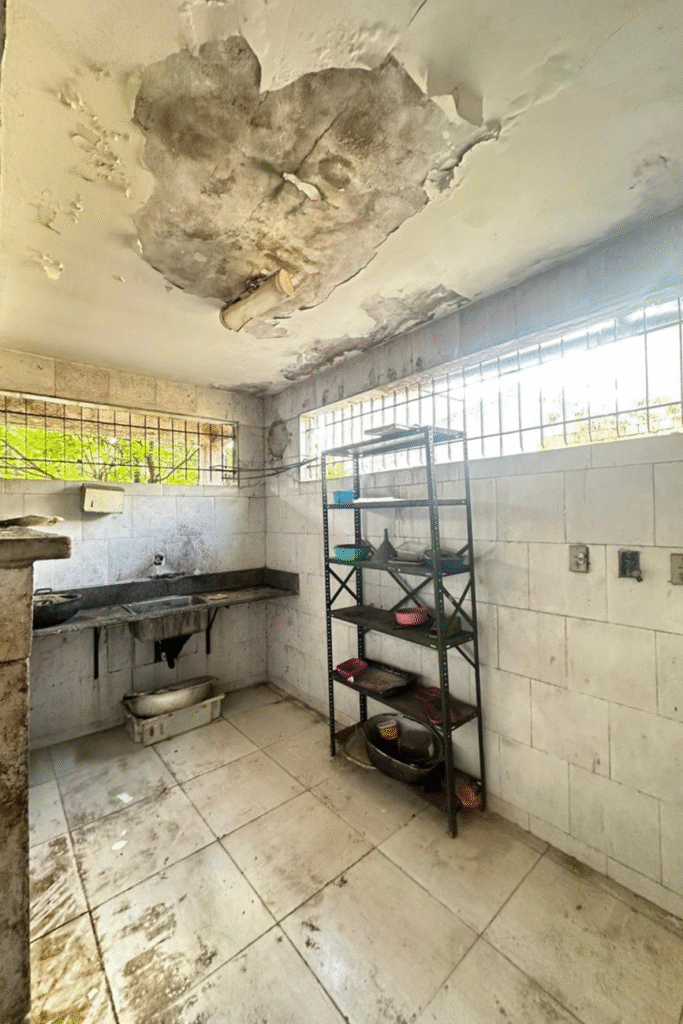 Durante a fiscalização, os técnicos da Divisa constataram condições insalubres extremas no local, com equipamentos de cozinha enferrujados, acúmulo de sujeira no chão, paredes e objetos, além de infiltrações nas paredes, comprometendo a higiene e a segurança sanitária do ambiente.